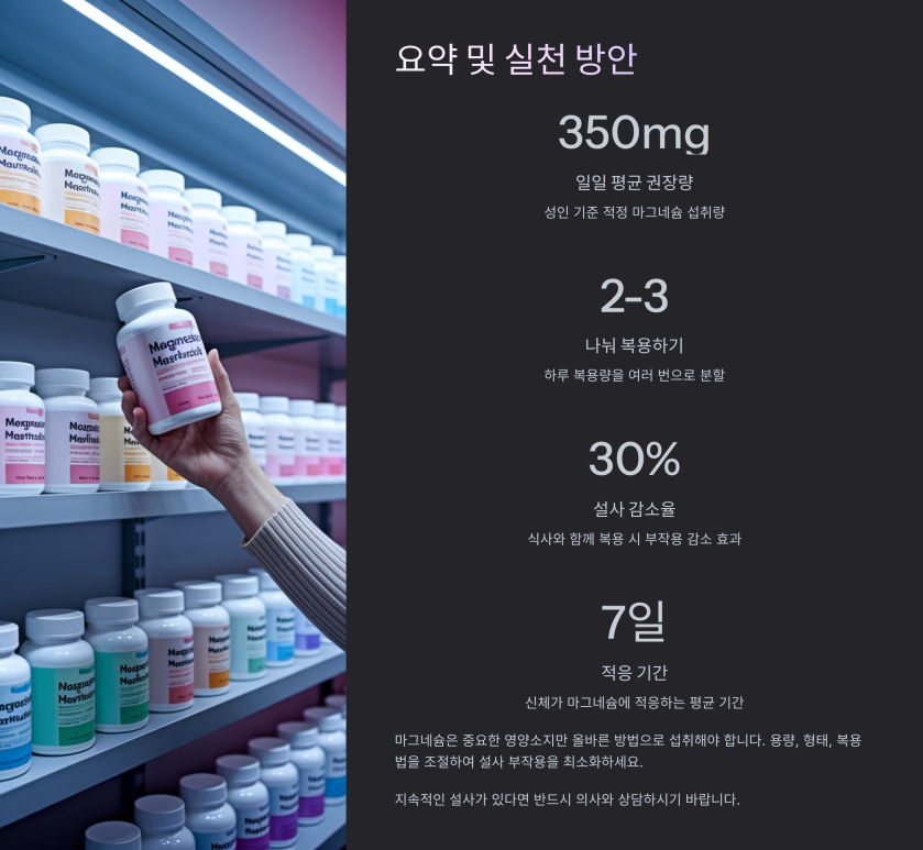 이 네 가지 원칙만 잘 지켜도 마그네슘으로 인한 불편한 증상을 상당 부분 예방할 수 있습니다. 무엇보다 몸 상태를 주기적으로 관찰하고, 장기간 설사가 지속되면 전문의와 상의하는 것이 바람직합니다.