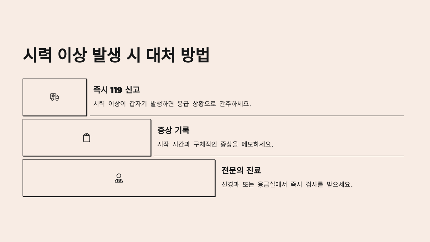 뇌경색 전조증상 시력 변화를 스스로 감지하는 것은 중요하지만, 자가 진단은 어디까지나 참고용일 뿐입니다. 정확한 진단과 처치는 반드시 전문의의 판단에 따라 이뤄져야 합니다. 다음과 같은 상황에서는 즉시 병원을 방문해야 합니다.