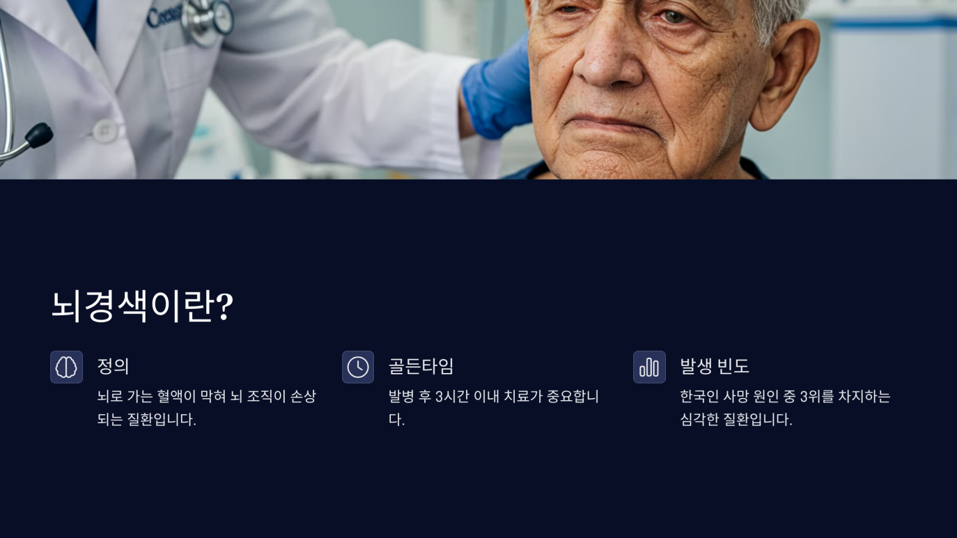 - ‘뇌세포는 시간과의 싸움’이라는 말이 있듯이, 골든타임(약 3시간)을 놓치면 치료 효과가 급감합니다.
