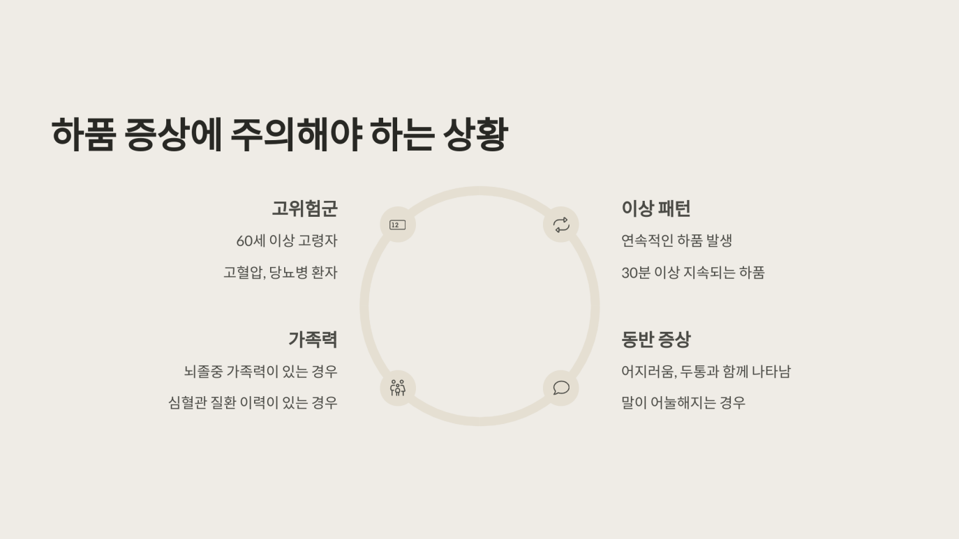 하품은 누구에게나 생길 수 있는 자연스러운 생리 현상이지만, 아래와 같은 상황이 복합적으로 나타날 때는 뇌경색을 의심해봐야 합니다.