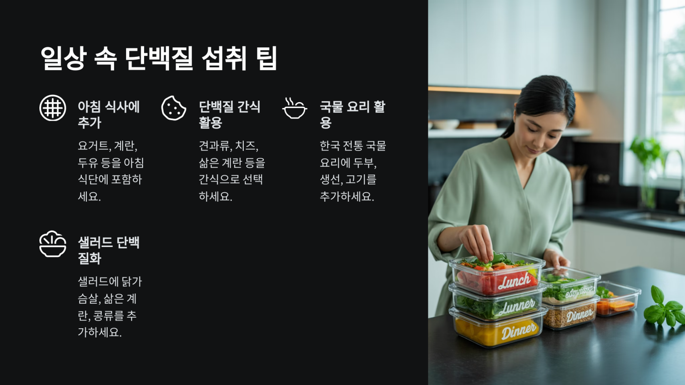 - 매 끼니마다 단백질 챙기기: 세 끼 식사에 골고루 단백질 식품을 포함하면, 하루 종일 안정적으로 단백질을 공급할 수 있습니다.