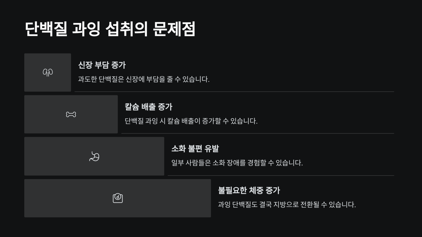 아무리 단백질이 좋다 해도, 과도한 섭취는 문제가 될 수 있습니다. 특히 신장 기능이 약한 분들은 단백질 대사과정에서 발생하는 노폐물을 충분히 배출하지 못해 신장에 부담을 줄 수 있습니다. 또한 단백질을 많이 섭취하기 위해 지방 함량이 높은 육류나 가공육을 과도하게 먹을 경우, 포화지방 섭취가 늘어나 심혈관계 질환 위험이 높아질 수 있습니다.