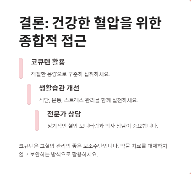 이 세 가지를 잘 조화롭게 실천한다면, 보다 효과적으로 혈압을 관리하고 심혈관 건강을 유지할 수 있을 것입니다. 꼭 “혈압 낮추는법 코큐텐”을 실행하는 데 있어서 무작정 시도하기보다는, 본인의 체질과 생활 패턴, 병력을 고려해 합리적으로 접근해 보시길 권장합니다.
