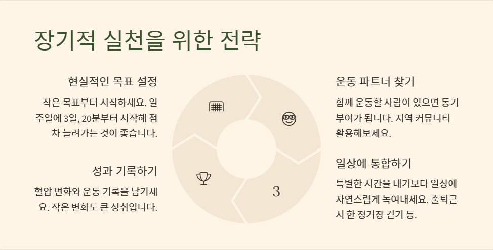 운동은 단기간에 끝낼 수 있는 프로젝트가 아니라, 오래도록 습관화해야 하는 라이프스타일입니다. 혈압은 매우 개인적인 신체 지표이므로, 나이나 건강 상태, 기존 질환 등에 맞춰 운동 강도와 방식을 조절해야 합니다. 무엇보다 꾸준함이 중요합니다.